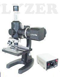 A very compact microscope usefull for small jobs and field work, Equipped with bright fileld horizontal 6V/20W halogen lamp, with seperate variable control power supply, fixed magnification of 50x OR 100x, focusing with rack and pinion movement.